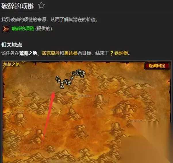 材料刷取地点: 荒芜之地、洛克莫丹、奥达曼。破碎的项链任务会提供给玩家,玩家需要前往三个区域完成任务,之后交付给铁炉堡的塔瓦斯德·基瑟尔。