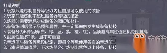 装备的品质分为6种【白、绿、蓝、紫、橙、红】,品质越高级属性随机范围也就越高。而打造出来的装备有几率拥有副属性,副属性一般加的是主角的额外属性,而且装备中有几率会触发装备特技。 并且当你打造装备积累的幸运值达到满时,下一次炼器必定可以打造出紫色以上的装备,并且特技出现的概率也会提升一倍。