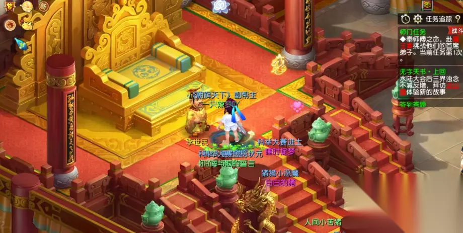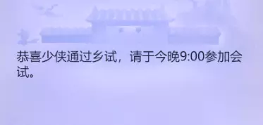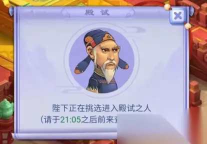 3.殿试部分 ①、参与条件:会试中最短时间内闯过所有关的20名玩家。(如果闯关成功的玩家不足,按比赛结束时答对题目最多、用时最少的顺序排名。) ②、活动时间:每月第二个星期日16:30——17:00。 ③、考官位置:长安皇宫的金銮殿,由皇帝主考。 ④、考试流程:开始答题后累计答对10题所用的时间计算,不受具体开始和结束时间的影响,每答错一题,用时将增加10秒,累计答错5题将被淘汰。