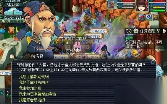 2.会试部分 ①、参与条件:人物等级≥30级且通过乡试 ②、活动时间:每月第二个星期日12:00——14:30。 ③、考试流程:在建邺城衙门前找任意一位1号考官(144,81)或(69,104)和(171,27)答题,考试题目采用选择题的方式,每一关答对后即可找下一关的考官答题,同一关答错两次后也将进入下一关,但累计答错10次即被淘汰。 ④、考官位置:可以根据提示依次找到后面的考官(也可在任务栏查看)。