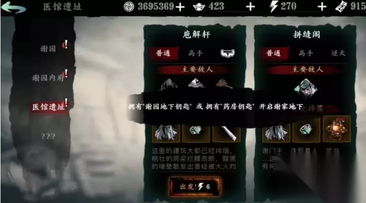 医馆遗址的解锁流程具有严格的线性逻辑。在完成谢园主关卡后,玩家需返回地图界面点击谢园图标进入内府任务,而非直接通过主线跳转。内府任务中的庖解轩是核心节点,其通关后系统会直接弹出医馆遗址的开启提示。部分玩家可能因跳过支线任务导致进度延迟,建议在推进主线时同步完成支线任务灭法司的残酷美学,该任务与医馆遗址的剧情关联密切。