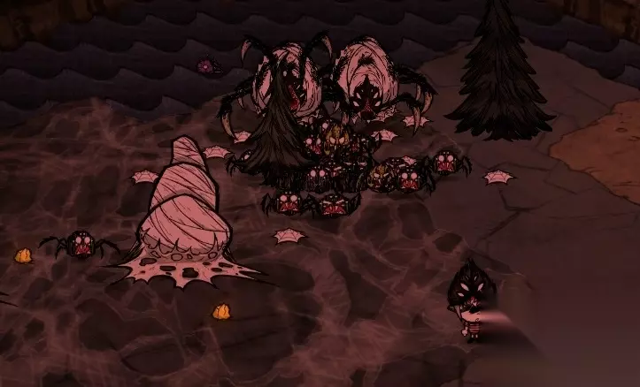15.到了35天左右,天气开始转暖了,赶紧补充资源 煮一些蜜汁肉、糖果、准备一些猪皮,哼哼,没错,我们要去收拾蜘蛛了 注意,35天过后,一部分蜘蛛已经成女王了,这才是打蜘蛛的最佳时期 (1)先打开地图,看看有没有落单的蜘蛛巢,到处逛逛,找到第一只女王 (2)灭了女王,弄到一个女王头盔 (3)只要有了一个女王头盔你就是蜘蛛克星了 (4)直接打开地图看看那里蜘蛛最多,咱门就去大扫荡 (5)第一个女王帽要节约用,看见蜘蛛门互相攻击就可以脱下来了 (6)随着女王数量增多,女王帽就能刷到一大把了,随便你怎么用了 一:如何用女王帽对付3层蜘蛛巢穴 (1)攻击一次蜘蛛巢,刷出第一波蜘蛛,带上女王帽收成小弟,命令继续攻击巢穴 (2)蜘蛛攻击巢穴后刷出第二波蜘蛛,脱下女王帽,看蜘蛛们 (3)第一波蜘蛛数量比第二波略多一点,所以这个巢穴必爆,耐心等一下即可 (4)如果附近有其他蜘蛛巢,继续用这个方法搞,最多同时搞3个巢穴哦,别太多 (5)如果你跑太远了,蜘蛛就停止攻击了,如果靠太近蜘蛛会攻击你 二:如何用女王帽子对付蜘蛛女王 (1)很明显女王自己生产的蜘蛛,你是不能收成小弟的 (2)在旁边找一个3层蜘蛛巢,连续攻击2次刷出全部蜘蛛,带上帽子收为小弟 (3)率领小弟会去杀女王,然后脱下帽子,把刚才那个巢穴打爆 (4)由于女王刚刷,没有生产多少小弟,女王是必死的,稍微等一下即可 (5)如果附近没有小弟招,可以跑,以后带二师兄再来,也可以肉搏 (6)你只要跑远一点,女王就不会继续生小蜘蛛了,所以没事就离他远点 就算你走位差一点,顶多被一两只黄蜘蛛咬一下,不废什么血 等地图大部分巢穴被清理完了,你也应该有大把女王帽子了,记得斩草除根 记得带篝火的素材,就怕碰上野狗什么的,没东西吃了回去补充 16.蜘蛛收拾光了,开始着手对付猎狗了,围墙+陷阱+肉搏 围墙只要不要造得太密集,狗就不会攻击城墙,而是绕路过来 稍微引导一下它的走位,可以让陷阱的效率更大化 注意一些地形,有些位置是神级打狗位置