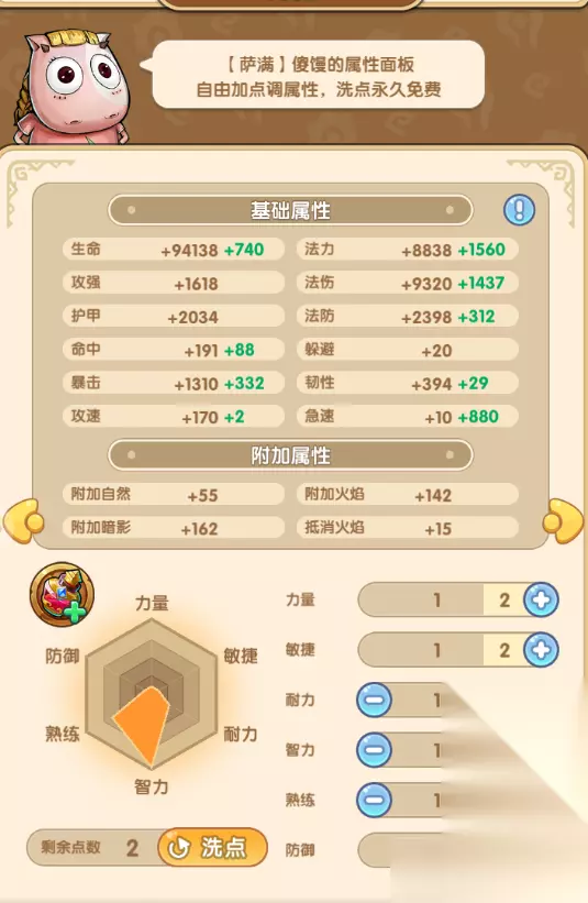 属性加点:因为定位还是偏向辅助,所以在属性加点上还是优先增加智力和熟练为主,智力主要是为了提升伤害增益和回复量,提升这些之后能够显著加强傻馒的功能性。而熟练则是为了降低技能的吟唱时间,因为傻馒的增益手段虽然非常全面,但大多都需要较长的吟唱时间,所以提升熟练之后,她的施法频率会大大增加。