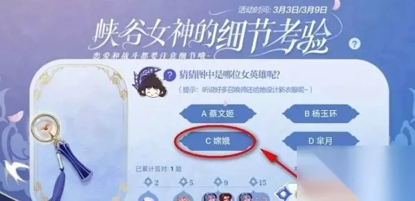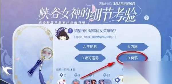 王者荣耀细节考验答案是什么?王者荣耀在3月3日-3月9日推出了“峡谷女神的细节考验”的精彩答题活动,而且奖励也是超级的丰富的,让您可以更好的去领取到了一定的奖励,下面就是王者荣耀细节考验答案大全了,一起来看看吧! 第一题:猜猜图中是哪位女英雄呢?