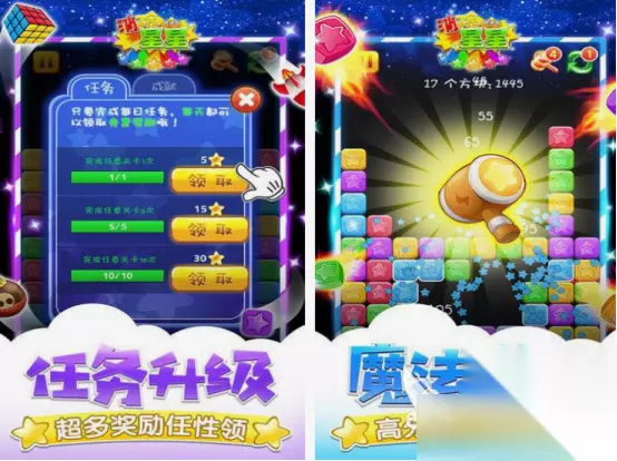 以经典的消除星星为主要的玩法,涵盖超多的主题,仿佛进入了七彩的世界一样,涵盖现实生活中各种颜色的星星,在屏幕上显示了各种颜色的以后,通过点击相同颜色,或者使用魔法道具以后,更有助于顺利通关。主要的难点就是每一次关卡当中,都有不同的任务。如果想要达到关卡当中,要求分数的话,的确使用相应的魔法道具,更有助于让你顺利的完成相应的任务。 高速下载 普通下载 3、《消星星酷炫版》