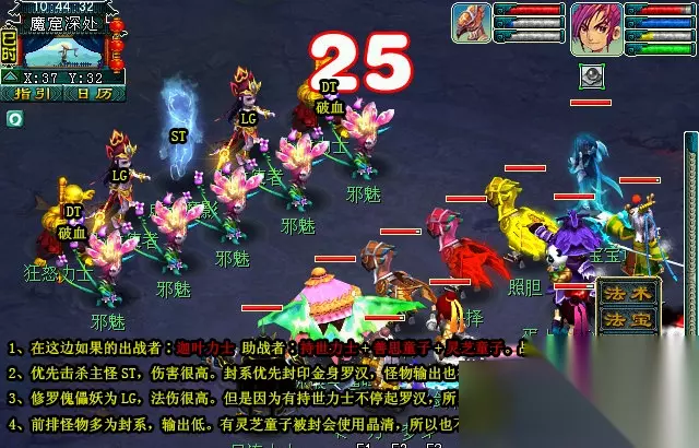 1、在这边如果的出战者∶迦叶力士;助战者∶持世力士+善思童子+灵芝童子。战斗就会很简单。 2、优先击杀主怪ST,伤害很高。封系优先封印金身罗汉,怪物输出也很高的。 3、修罗傀儡妖为LG,法伤很高。但是因为有持世力士不停起罗汉,所以无压力。 4、前排怪物多为封系,输出低。有灵芝童子被封会使用晶清,所以也不用担心。