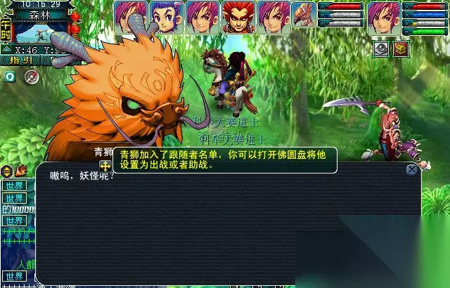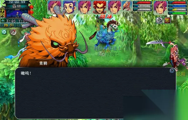 完成任务后,跟文殊对话后。传送到森林中,找到青狮战斗。