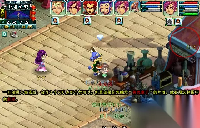 开始进入场景后,会有3个NPC点那个都可以。如果你想触发“善思童子”的片段,就必须选择图中的壮汉;〔具体看后面支线任务,主线任务不多说了〕。