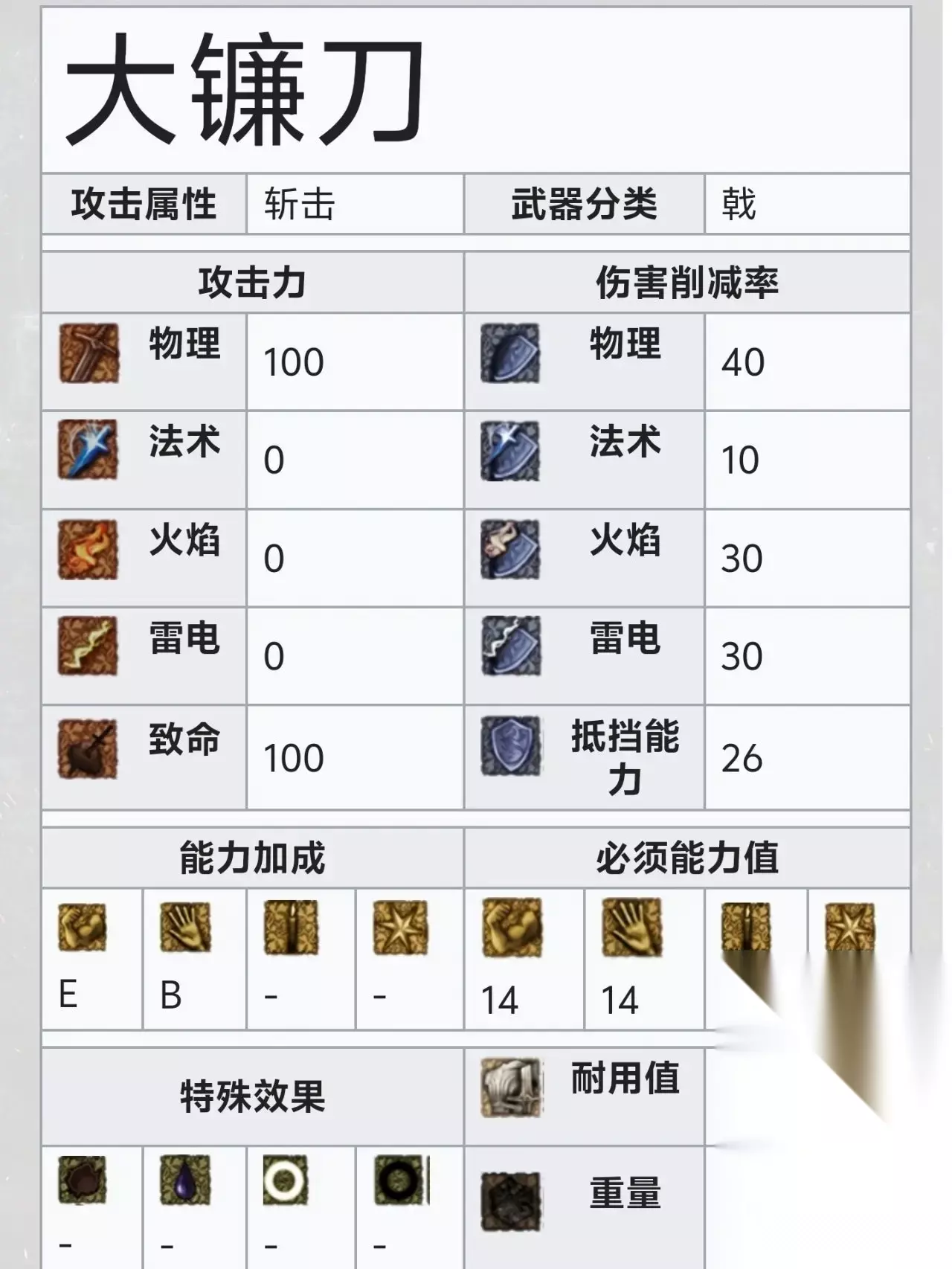 力敏武器,这个是仅次于黑骑士戟的一周目神器,大前期就能轻松获得,超大的范围带来满满的安全感,双手大剑的伟大无需多言, 6大镰刀