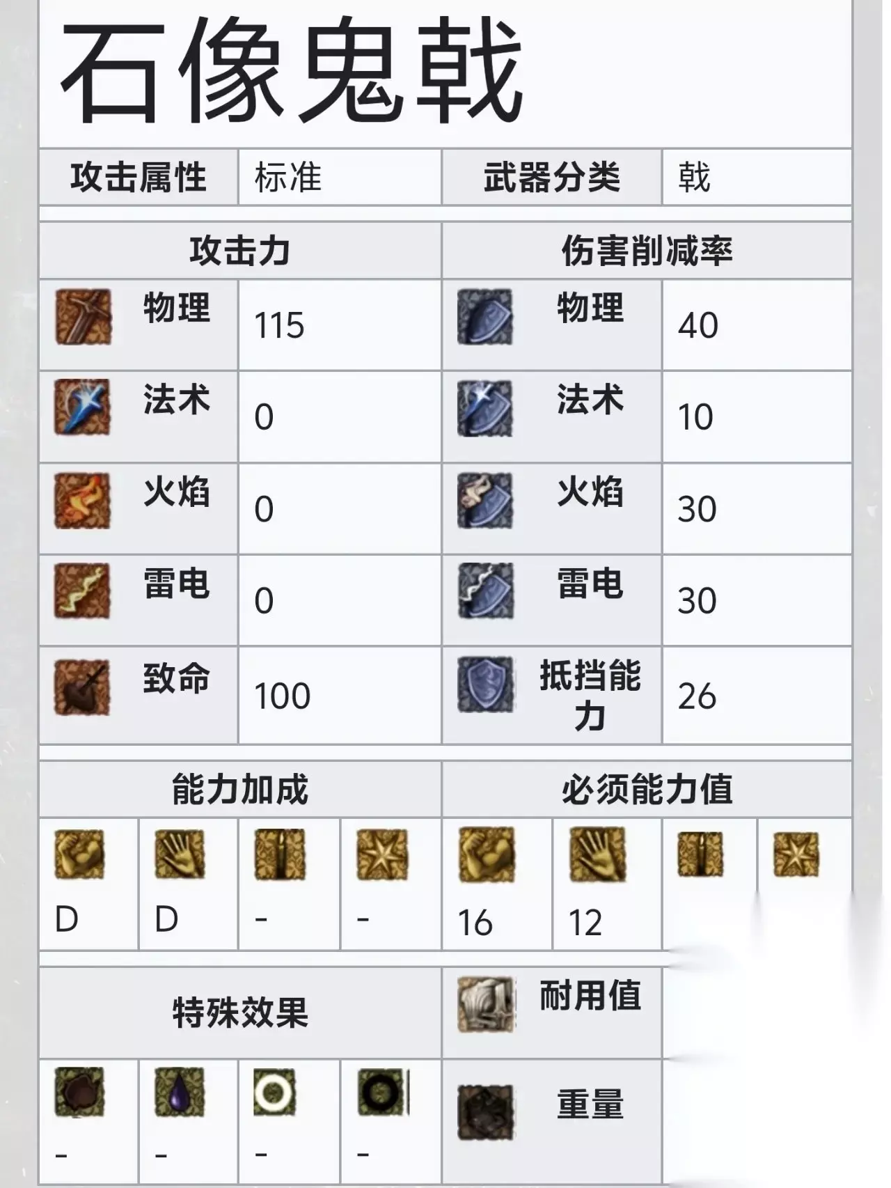 真正的经典,不错的攻击模组,不错的重量,不错的加成,不错的攻速,不错的范围。可单可双,泛用性拉满,如果你不知道该用什么,那就朴实无华的大剑吧。 3石像鬼戟