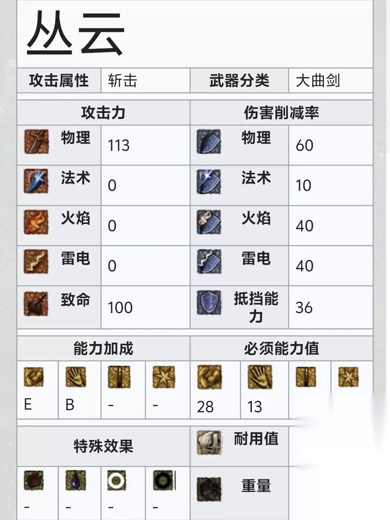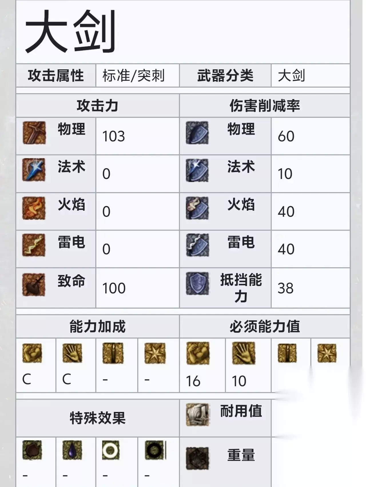 全游第二面板,相比其他大型钝器,巨型棍棒的12的重量可以说很轻,对力量的需求也仅仅28点,在魂1前期本就紧张的负重百分比中占据很大优势,同时还具备着很长的攻击距离,滚动攻击具备大范围,重击模组是下砸,轻松让人型敌人再起不能。是力量流的大杀器。 2大剑