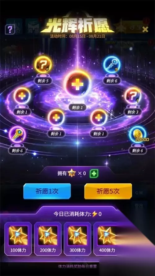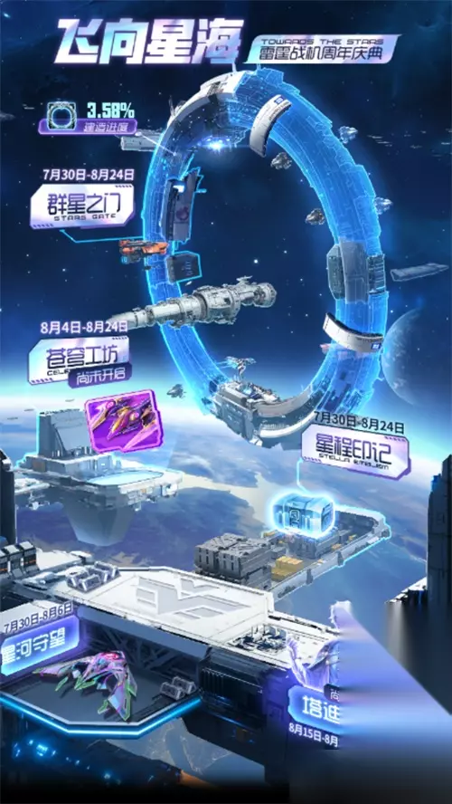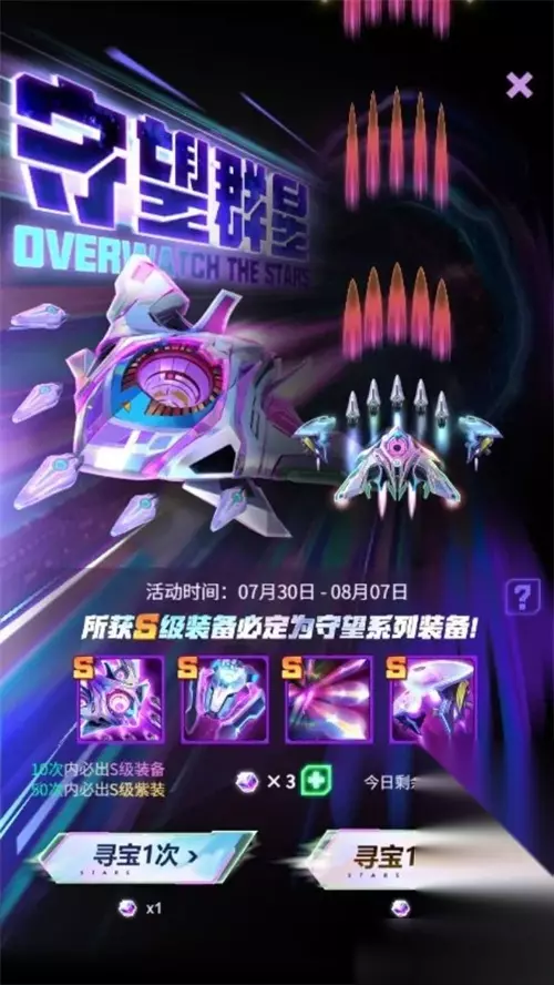 【活动时间】 1.新战机专属奖池,7月30日~8月7日,持续9天,按需抽取。 2.驾驶员光辉祈愿,8月15日~8月21日,持续7天,建议是拉满。 3.周年庆限时活动,7月30日~8月24日,内有大量福利,整合多种活动。 4.苍穹工坊,8月4日~8月24日,三大战神皮肤上架和返场,还有其他装备皮肤返场。 5.星程印记,7月30日~8月24日,周年庆签到活动,其中8月4日和8月19日有特殊大奖。 6.新玩法,首期时间8月2日~8月11日,星系争夺战。 ※全新战机伴随专属奖池上架,15000钻石可购买30个道具,50抽一次保底,该奖池所有S均为新战机系列,按个人情况选择抽取。当然,新装备仍然可以通过寻宝、合成、无尽宝箱等渠道获得。
