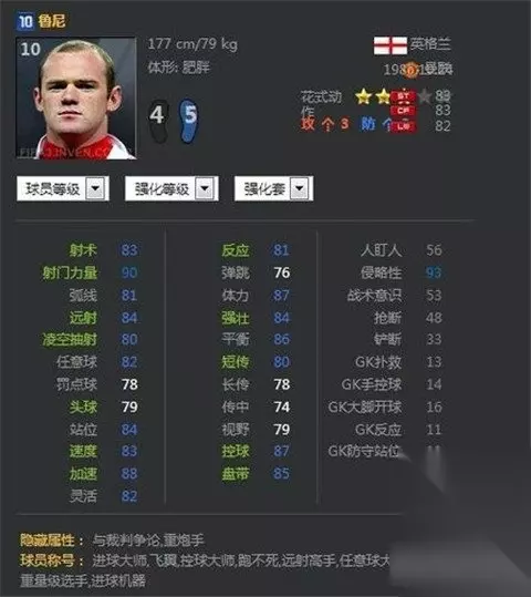ST:强壮84、加速88、速度83、盘带85、控球87、短传80、射术83、射门力量90、头球79、远射84、凌空抽射80、站位84、反应81; CF:加速88、速度83、盘带85、控球87、短传80、射术83、射门力量90、头球79、远射84、站位84、视野79、反应81; LW:加速88、速度83、灵活82、盘带85、控球87、传中74、短传80、射术83、远射84、站位84、视野79、反应81; 已获取到的称号有进球大师、进球机器、飞翼、控球大师、重量级球员、杂耍高手、任意球大师、远射高手、跑不死; 特殊能力有与裁判争论、重炮手 FIFAOnline310U鲁尼,作为一名ST,也可以打CF和LW,作为曼联的首席射手,鲁尼在游戏中的数据,是很华丽的。ST的各项能力,除去头球略有不足,其余的,都是80上,这让10U鲁尼,成为一名优秀的前场杀手。在CF和LW位置上,数据也是可圈可点。同时,几乎把一名进攻选手可以具备的称号都集于一身,让10U鲁尼,成为超级射手。