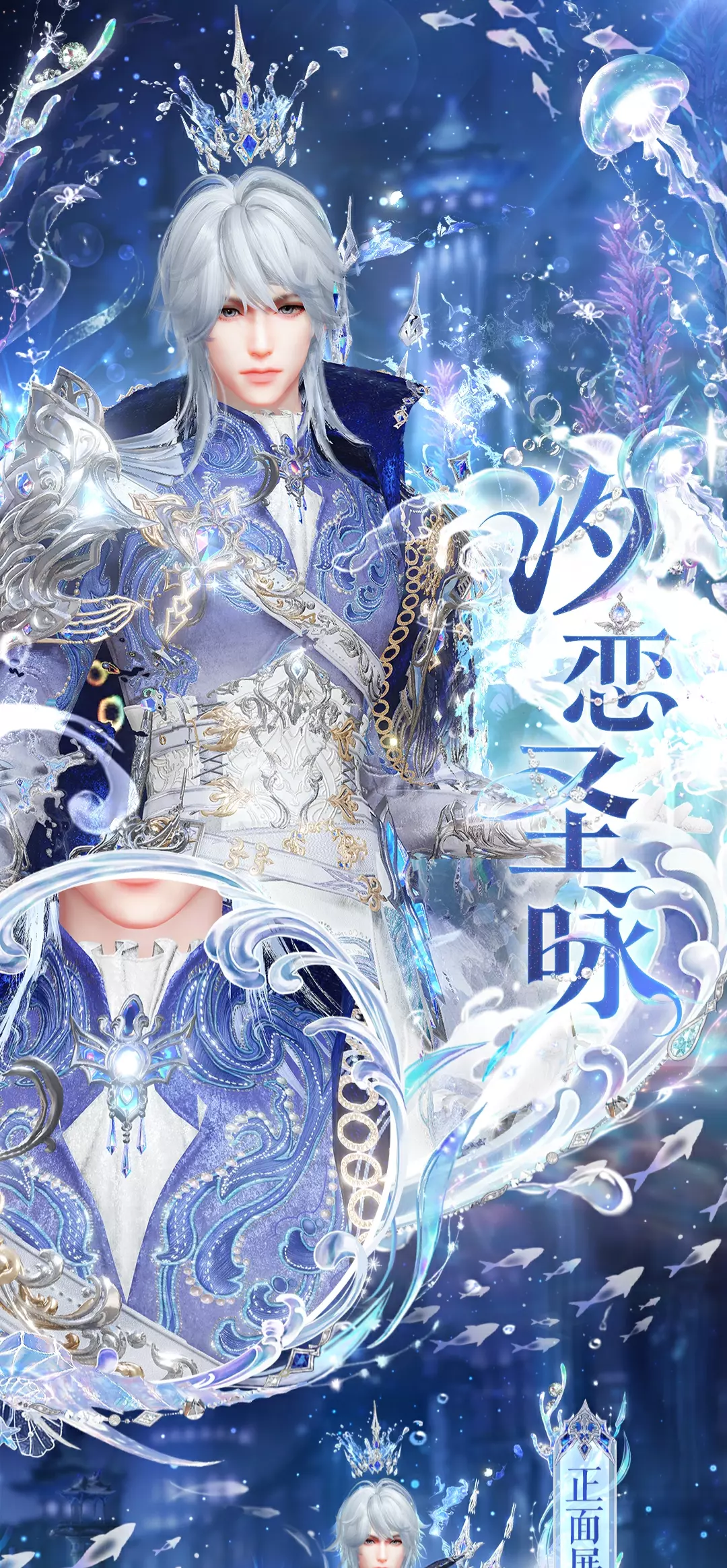 圣洁的蓝白色调,仿似海洋的辽阔与纯粹。骑士礼服剪裁利落,凸显挺拔的身姿,肩部覆盖精致雕琢的肩甲,胸前点缀着蓝色宝石胸针,宛若深海之心。