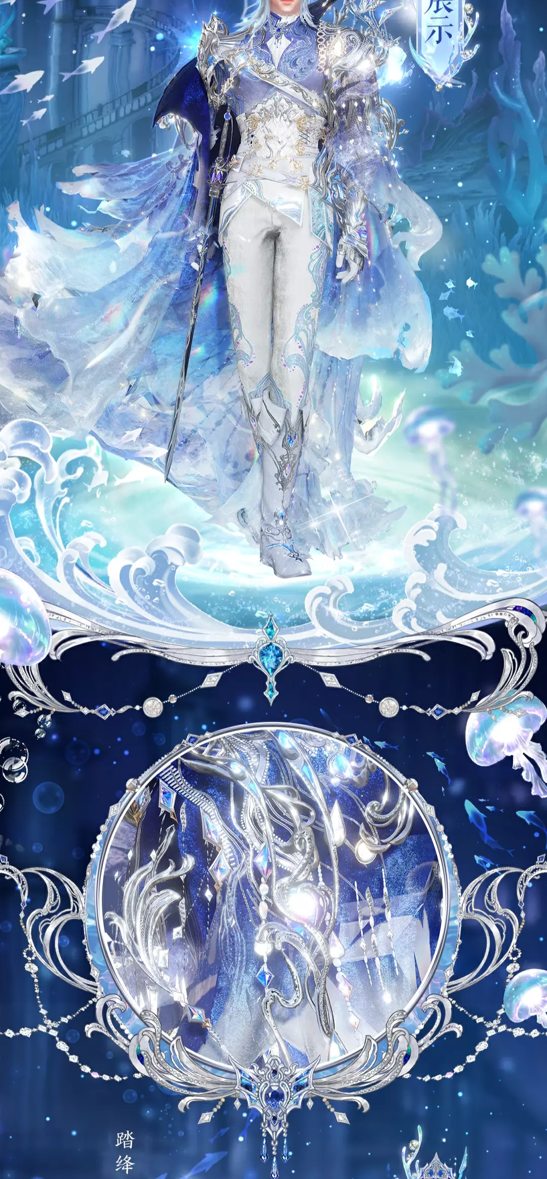 金属护手冰冷而坚定,腰间悬挂的冰蓝长剑闪耀着凌冽的光芒,象征着不容侵犯的王权。衣襟上华丽的金属配饰和水波纹刺绣,是海底神殿的缩影,长靴上镶嵌的蓝色宝石与腰间的蔚蓝长剑交相辉映。