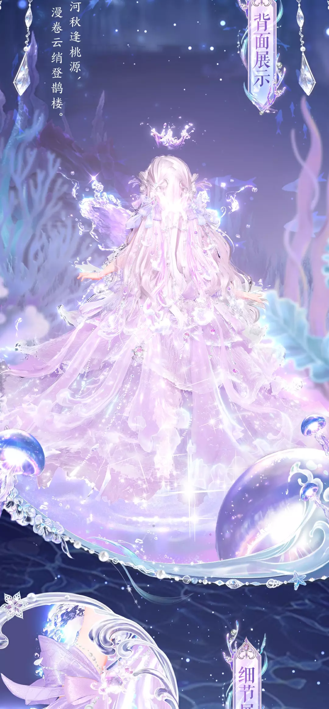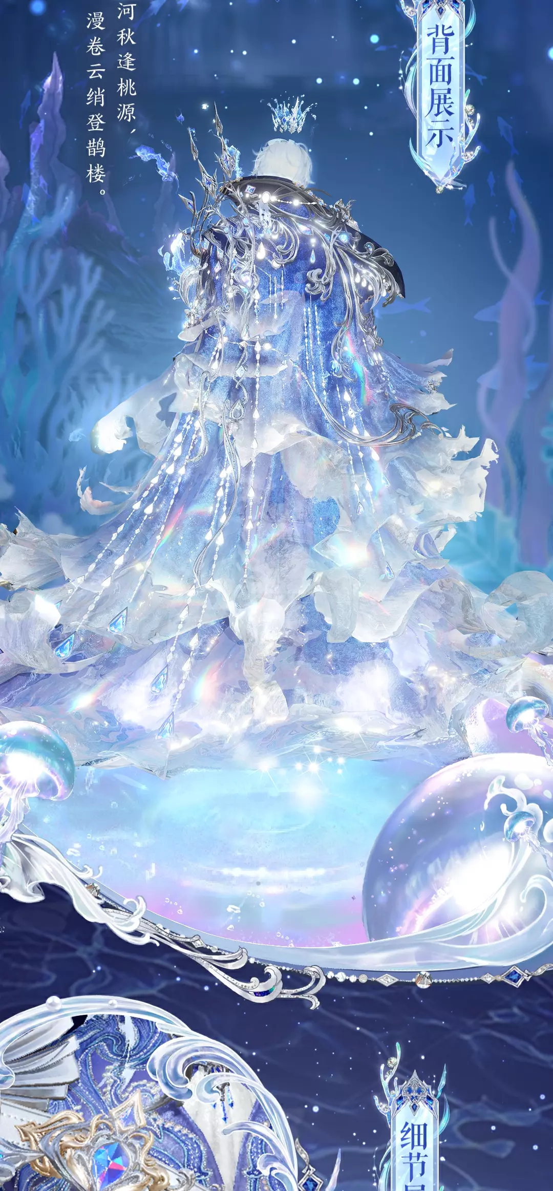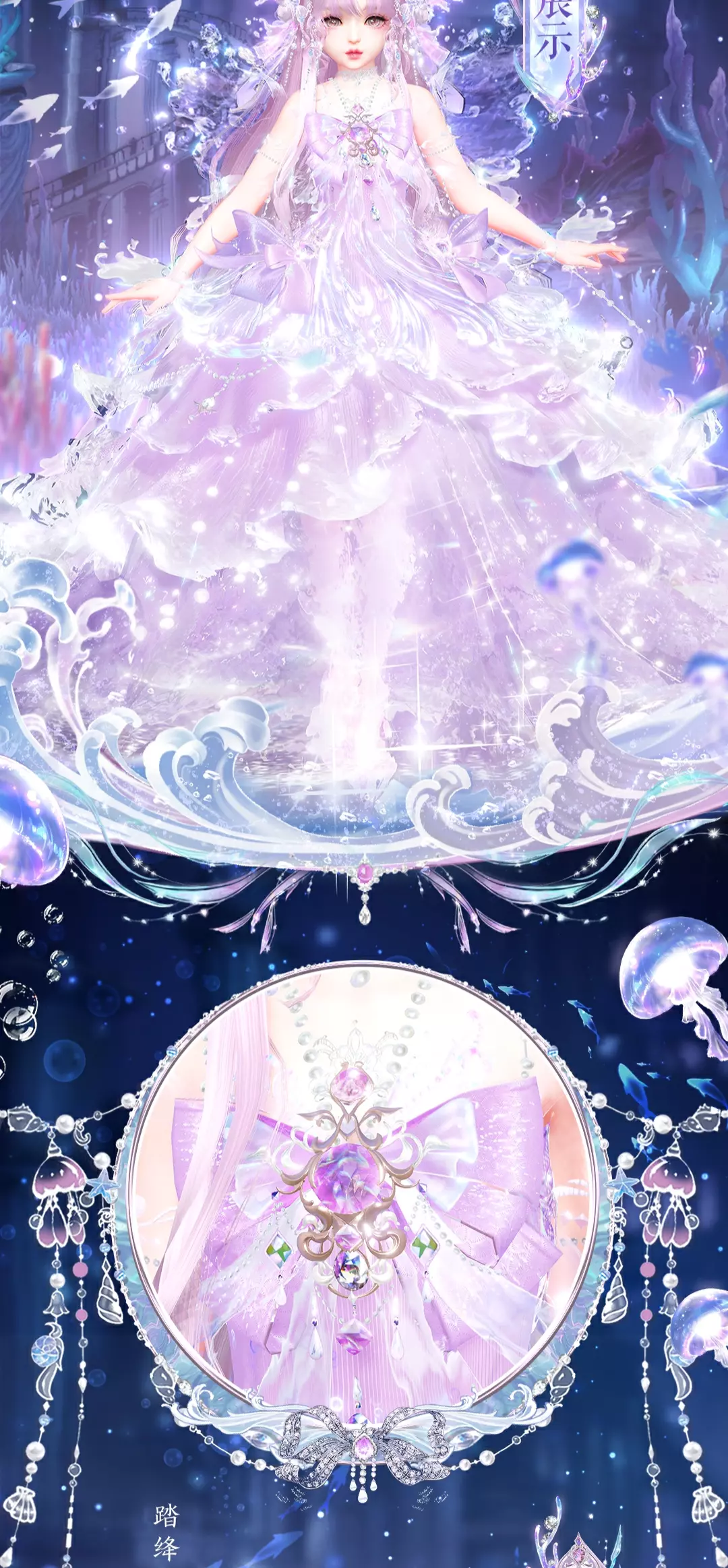 下身则绽开为华丽绝伦的裙摆,行走层叠的褶皱荡漾出涟漪,宛若起伏的海浪;外层纱幔的水珠链饰与游鱼共舞,仿佛整个海洋都成为了她的裙装。腰间的蝴蝶结绸缎点缀宝石珠链,以绸缎为画布,浪纹作笔触,为她的高贵加冕!