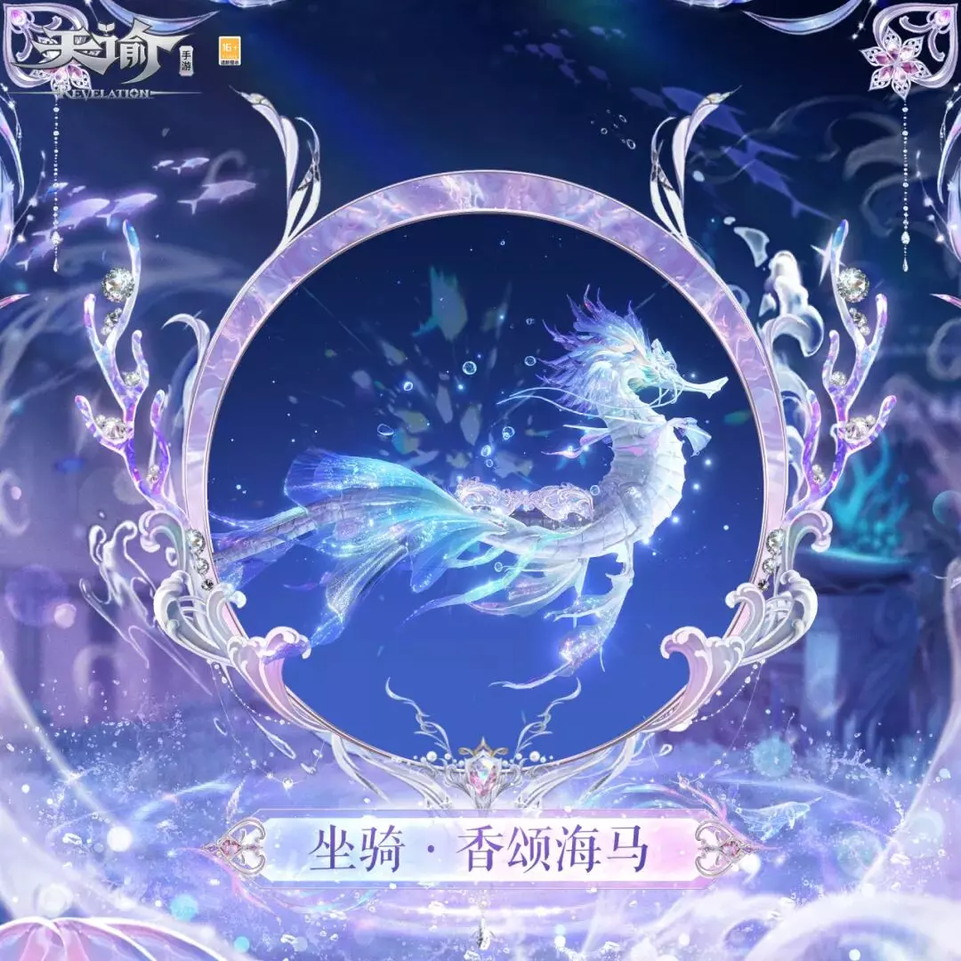 海马驮着星屑与珊瑚,将海水泡泡哼成发光的香颂。兽首化作晶莹海马,修长脖颈覆盖珍珠鳞片,延展出修长优美的游龙身躯,姿态优雅而矫健,游动时洒落星屑光尘。