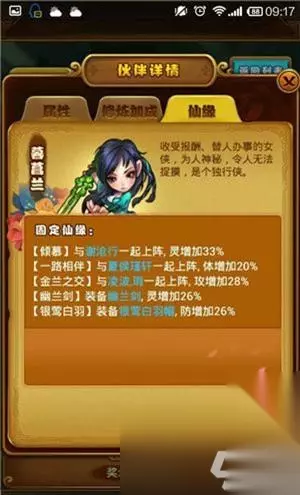 【仙缘】 倾慕:与谢沧行一起上阵,灵增加33% 一路相伴:与夏侯瑾轩一起上阵,体增加20% 金兰之交:与瑕、凌波一起上阵,攻增加28% 幽兰剑:装备幽兰剑,灵增加26% 银莺白羽:装备银莺白羽毛,防增加26% 更多资讯请关注口袋巴士《仙剑奇侠传》专区 《仙剑奇侠传》全新月签伙伴暮菖兰全面解析