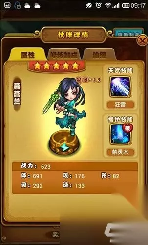 【基础属性】 品阶:五星13品 属性:雷 体691 攻176 防82 灵292 速133 战力623