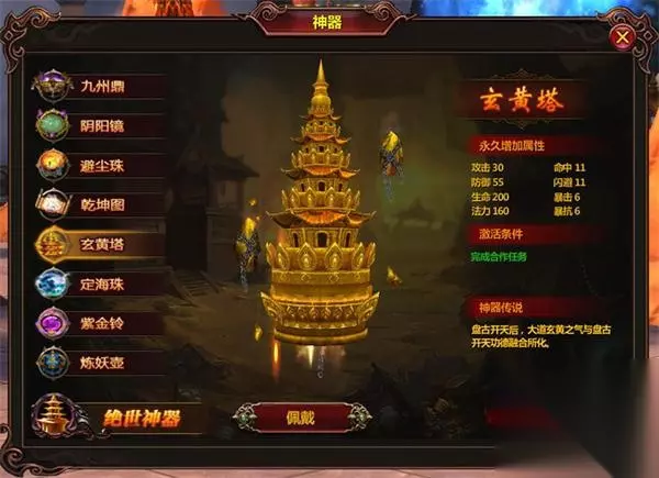 t15_2-t15_1:5.0 天地玄黄,宇宙洪荒,日月盈仄,星宿列张。自古以来,中华文化中不乏各种神器的出现,如治理黄河的河图洛书、黄帝手中的轩辕神剑、神农解百毒的神农翠尺,都属神器之列,在悠悠的历史长河中,虽然有些神器下落不明,但依然有许多神器存于世间。由六月游戏独家代理的的全球首款东方玄幻、盗墓题材的3D微端网游《寻龙战纪》中存在着八大神器,都让人趋之若鹜,这些神器究竟如何厉害?且听小编一一解答。 【盘古开天 天地玄黄之气凝聚成塔】 玄黄塔,又名天地玄黄玲珑宝塔,盘古开天,大道感应,洪荒虚空生出无量的天地玄黄气充斥天地之间,逐渐凝结成一尊宝塔,宝塔初时有万丈高下,不一会儿就凝成了一尺高的小塔 ,一旦祭出先立不败。是混元大罗金仙—太上老君的防身法宝,能轻易抵御诛仙剑阵、紫电锤等顶尖法宝的伤害。传说为盘古开天所化的第一防御至宝,又得天地玄黄气所化的玄妙至宝,为第一防御法宝,无坚可摧。如果在摸金过程中遇到不测,玄黄塔可保无虞。