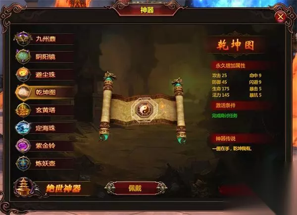 【乾坤太极图 袖里乾坤显真功】 乾坤太极图,是三大先天至宝之一。呈混沌阴阳色,显现"大道无极"之象。太极图周身霞光万道、瑞彩千条,图外"大道谶言"环绕其上、图内"天道符箓"隐现其中。五色毫光照耀山河大地,九彩瑞气震慑诸天寰宇。太极图展,天地动容、日月变色,无上至宝之威显露无疑。太极图玄妙无限、造化无穷,可化解一切攻击,无视任何防御。有此等神器,还怕什么?勇敢的前进吧。摸金倒斗也可以正面刚!