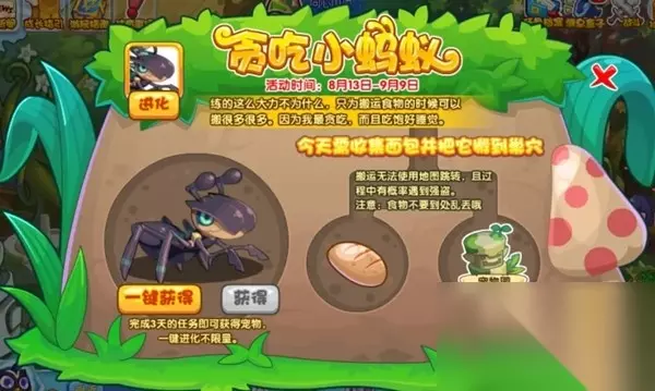 洛克王国贪吃小蚂蚁活动攻略大全 完成三天的任务就能拿到宠物,三天的任务还有可能不一样的 1、去石残垣和面包嘟嘟战斗,然后得到50个面包,然后去指定地点。 2、活动页面跳转,然后不使用地图,按照宠物园-索米亚草原-普拉塔草原-独角仙踪的路线将50个面包搬运到独角仙踪就完成了。