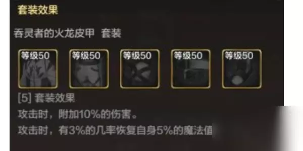 2、防具 刷图:吞灵者的火龙套装、地灵绝魂轻甲套装 原因:地灵绝魂轻甲套装拥有当前版本最强的伤害加成和力量加成,所以用来刷图也是很不错的选择,地灵绝魂轻甲套装总共属性:面板物理攻击力+20%,伤害+15%,力量+10%。吞灵者套装属性也不错,套装总共属性:物理面板攻击+12%,伤害+17%,力量+5%。但是吞灵套装有更高的攻速和释放还有皮甲精通的加成,伤害也是非常高的。 PK:吞灵者的火龙套装、奥德利的蛟龙套装 原因:PK需要用职业精通的SS套装,因为套装属性是不带入的,但是皮甲精通的属性是带入Pk场的。 ①吞灵者的火龙套装效果