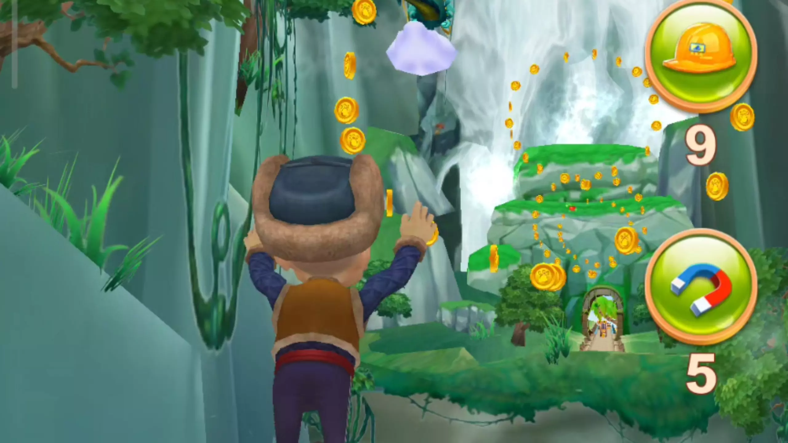这是童年向的《熊出没之熊大快跑2017版本》跑酷游戏展示,玩家操控熊大在林间跑道奔跑,沿途收集金币、宝箱,还能使用安全帽、磁铁等道具,躲避老虎等障碍,积累里程还能获取奖励。