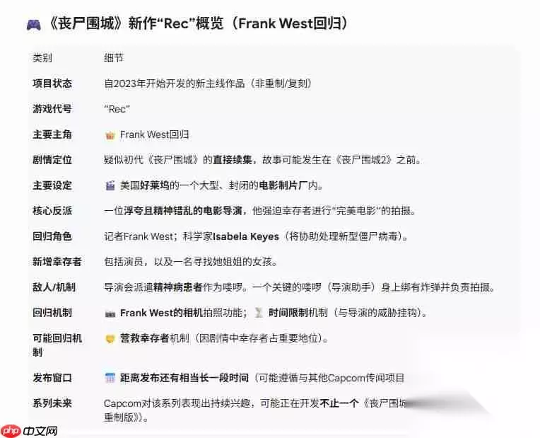 我们早已知晓卡普空手中掌握着众多尘封已久的经典ip,而公司自身也对此心知肚明。去年,capcom曾公开表示,计划通过一系列新项目重启这些经典系列,其中就包括已正式公布的《鬼武者》重启作以及《大神》续篇。 近期,该策略再次惠及另一个经典系列——《丧尸围城》。随着《丧尸围城:豪华复刻版》的推出,这款对初代作品进行全面现代化升级的重制之作,在媒体与玩家间收获了广泛好评。 如今,据外媒MP1st援引内部消息来源透露,《丧尸围城》系列又一重量级项目正在秘密开发之中。该项目并非简单的复刻或重制,而是系列正统的新篇章。MP1st同时披露了部分关于本作背景设定与剧情走向的关键信息。 《丧尸围城:“Rec”》剧情首曝与核心细节 知情人士指出,这款暂被称为“Rec”的全新作品自2023年起便已启动开发,且将见证系列人气主角弗兰克·韦斯特的重磅回归。这一动向尤为引人注目,因为种种线索表明,本作极有可能是初代《丧尸围城》的直接续作。不过需注意,目前尚未有官方确认,因此相关信息仍需谨慎看待。