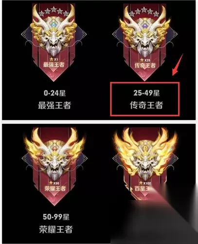 随着前段时间的s26赛季的更新,王者荣耀推出了全新的段位机制,它主要是针对达到王者段位之后的玩家,将各个不同等级的玩家之间区分开来,相信不少玩家们正在努力上分达到这些目标,小编今天就为玩家们解析下这些段位的要求和区别。 王者荣耀传奇王者 王者段位更改划分为:最强王者0-24星,传奇王者25-49星,荣耀王者50-99星,百星王者100星 ,所以传奇王者需要25星以上。