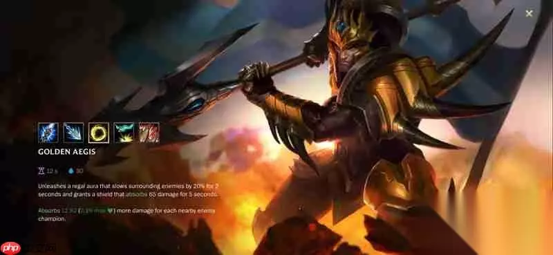 二技能-黄金圣盾 激活后获得一个吸收伤害的护盾,并对周围敌人施加减速效果。在团战中,这一技能不仅提升了皇子的存活率,还能有效限制敌方移动。与大招配合使用时,可形成连贯的控制链,令敌人难以脱身。