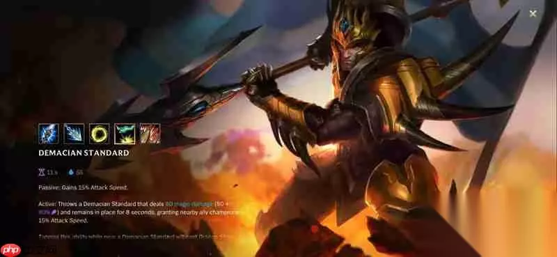 三技能-德邦军旗 向指定位置投掷德邦军旗,对落点附近的敌人造成魔法伤害。军旗将为周围友军提供持续8秒的攻击速度加成。该技能不仅具备团队增益效果,也是皇子连招体系中的关键一环。