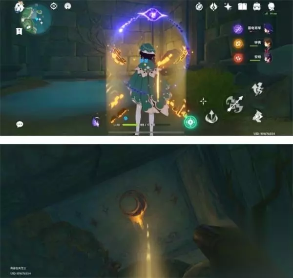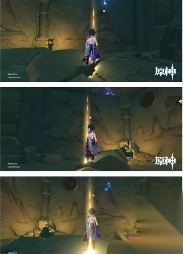 第一道石门前 壁画一 使用「羽毛」扫描印有雷鸟的墙壁,可打开墙壁,进入后往右走,进到小房间里将视角向上移,壁画在上面。