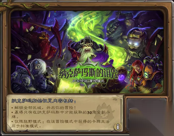 纳克萨玛斯的诅咒这个冒险故事线也是非常的长,共计有五大区15个小任务,每个区的BOSS都会掉落一张橙卡,完成其他小区的任务也会获得15张卡牌,包括两张紫卡。这个年代比较远的冒险故事,这次打折是激起了很多玩家的回忆,当初为了几张卡牌破费的玩家是真的不多,如果你还没尝试过这个有趣的冒险模式,那这次就不要错过了。