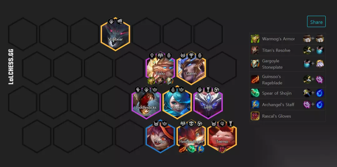 (4)【阵容二】 (5)阵容推荐:璐璐、艾翁、稻草人、加里奥、盖伦、狗熊、提莫、大头、格温 (6)阵容羁绊:3秘术3亡魂2小恶魔2神谕2复苏2骑士1驯龙宝宝1大魔王1胜利军