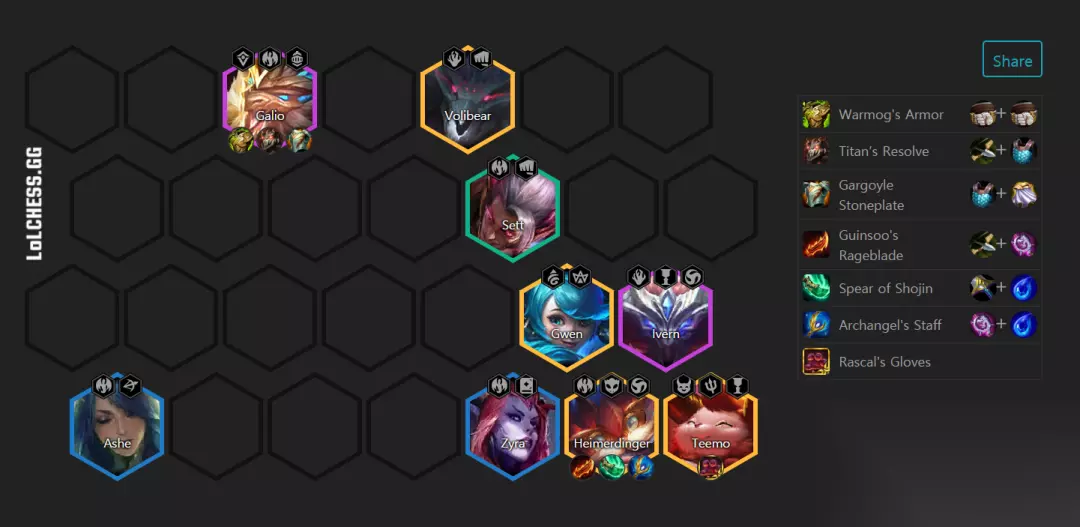 目录: 1.阵容搭配 2.阵容解析 3.装备推荐 4.运营攻略 1.阵容搭配 (1)【阵容一】 (2)阵容推荐:瑟提、寒冰、婕拉、艾翁、加里奥、提莫、大头、狗熊、格温/盖伦 (3)阵容羁绊:5龙族 2亡魂 2神谕 2复苏 1大魔王 1胜利军 1驯龙