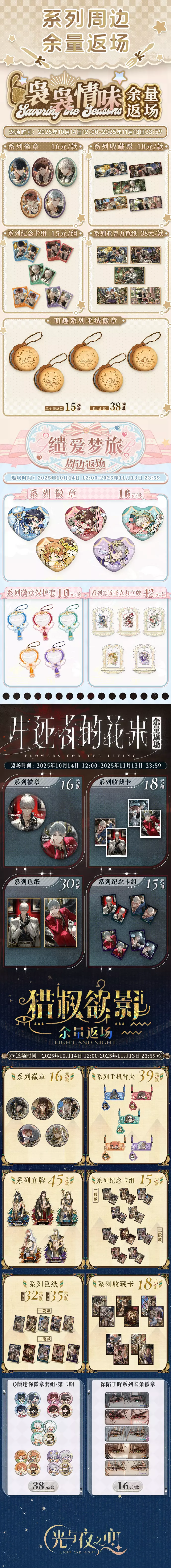 微间绮想夜、共赏明月、光夜变奏Ⅲ-行至灿烂尽头、2026纪念台历限时周边新品和袅袅情味、萌趣毛绒徽章、缱爱梦旅、光夜变奏Ⅲ-生还者的花束、猎权欲影、Q版迷你徽章组·第二期和深陷于眸系列周边余量返场,即将开启!