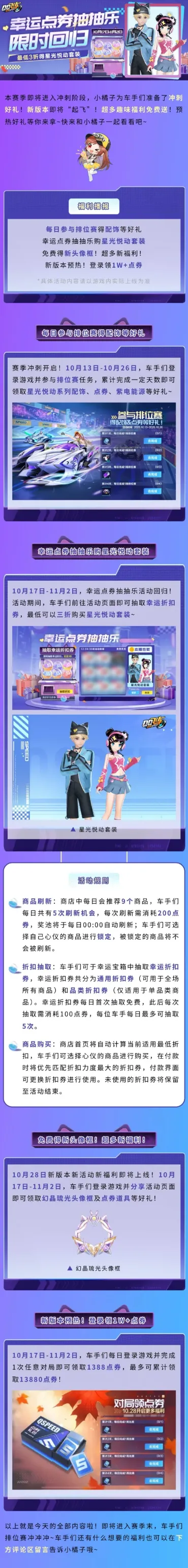 S48赛季进入冲刺阶段!赛季末冲分好礼送不停~车手们超喜欢的星光悦动套装限时回归,更有全新版本即将“起飞”!预热好礼等你来拿~快来点击下方图片和小橘子一起看看吧~