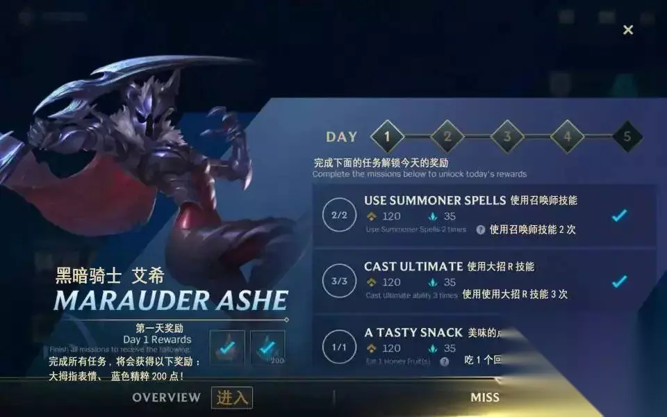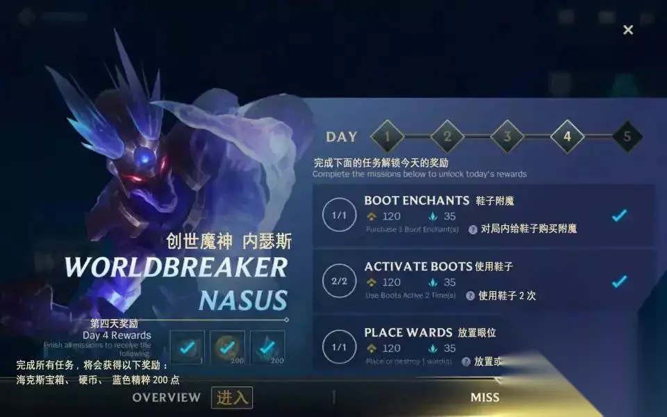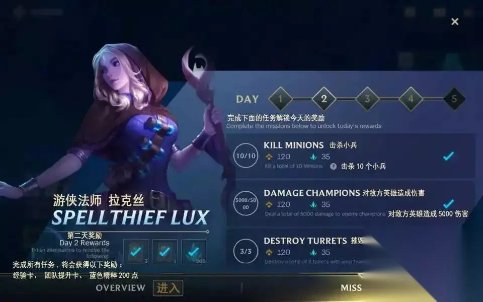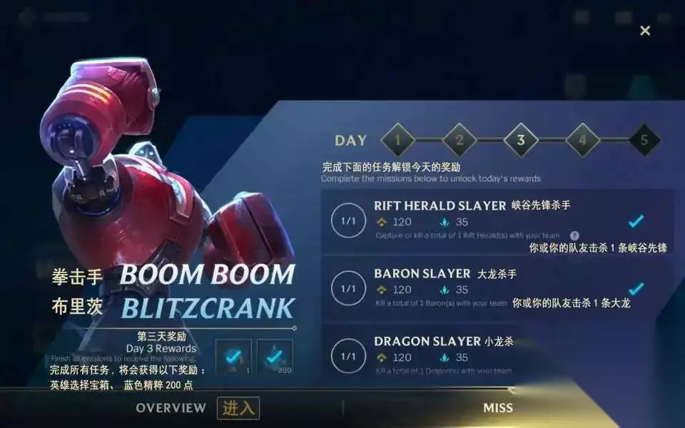 新手皮肤宝箱获取攻略 【新手皮肤宝箱】 凡是上线参与五天新手任务并且都把任务完成的玩家就可以获得皮肤宝箱啦,宝箱里面一共有五个皮肤,玩家可以根据自己喜欢的来选择一款永久的皮肤。 进入游戏后点击左上角的events图标就可以进入活动页面了,已经完成任务的小伙伴们可能看不到这个图标,点击左下角的ENTER进入WILD RIFT ACADEMY活动,点击右下角的MISSIONS进入活动任务界面。任务分为5天,每完成1天的任务可以在任务界面左下角领取一次奖励,完成第五天的任务之后就可以领取皮肤宝箱。