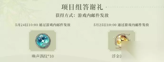 3、项目组答谢礼 阶段一:2024年5月24日 10:00通过游戏内邮件发放 阶段二:2024年5月25日 10:00通过游戏内邮件发放