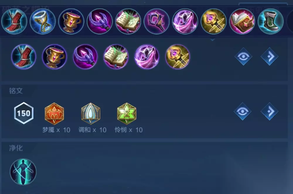 在出装方面,推荐冷静之靴、噬神之书、破碎圣杯、极寒风暴、虚无法杖和贤者之书。冷静之靴可以减少冷却时间,噬神之书可以提高续航能力,破碎圣杯则可以增加前期冷却缩减和最大法力值,极寒风暴可以增加物理防御、最大法力值和冷却缩减,虚无法杖则可以增加法术穿透和法术攻击,贤者之书则可以增加大量法术攻击。 出装推荐 10个怜悯可以提供10%CD加上冷静之靴15%cd以及圣杯15%就能攒够40%的冷却,而圣杯加时之预言的提供的额外生命值血量就能攒满破茧之衣的被动。 贤者之书比较卡经济,但10%的冷却以及高伤还是值得的,当我们出完了贤者之书和辉月之后,你会发现冷却溢出了20%,这时候就要变装,冷静之靴换成抵抗之靴,噬神之书换下圣杯,此时冷却就是正常的了。如果敌方控制较多的话可以将大书的位置换成抵抗鞋,s33赛季梦魇改版之后对面回复能力较强时可以将大书换梦魇之牙。