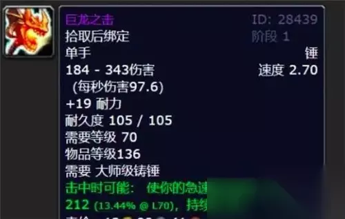 巨龙之击,有一个攻击触发212急速等级的特效,持续10秒。目前战斗覆盖率很不错,跟猫鼬附魔差不多,有增强萨玩家昨天刚刚测试过,狂暴战用起来也一样。而在测试服,P4阶段巨龙之击会变成单手武器,可以让玩家双持两把,副手的巨龙一样可以触发急速特效,而且并不会减少触发率——有人体感副手武器特效触发概率低,是因为主手武器有各种攻击技能增加了出伤频率,比如嗜血和英勇打击,增强萨就就没有这个问题。