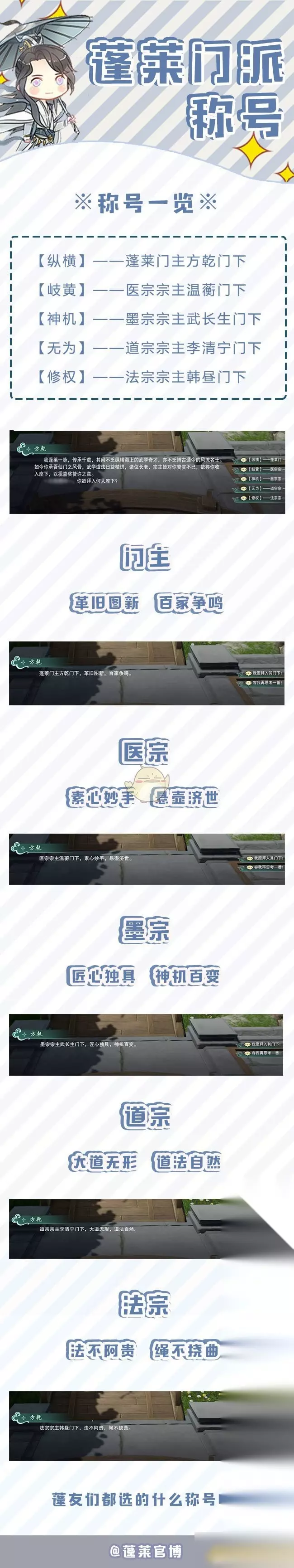 剑网3新门派蓬莱已经在新版本中上线,想必有很多人已经体验了一把。但由于测试资格原因,仍有很多人对其并不了解,最近就有同学问道蓬莱门派称号是什么?对此小编为大家带来剑网3蓬莱门派称号汇总,一起来看看吧。 《剑网3》蓬莱门派称号大全 蓬莱有五个门派称号,分别对应门主、医宗、墨宗、道宗、法宗门下。首先需要在门主方乾处进行入门宣誓,然后做一系列任务,了解蓬莱和四宗之后才会选择称号~ 有个小彩蛋:蓬莱四宗NPC衣服颜色主体都是白色,但是配色各有不同。法宗白色配红色,墨宗白色配黑色,医宗整体是白色,道宗白色配天青色。