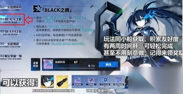 《碧蓝航线》黑岩射手联动活动攻略: 一、活动省流版 角色不用抽,专武获取容易 限定外观向道具(家具、装备外观)丰富 挑战关卡简单,在6月19日前任意登陆一天就足够肝完角色+专武 二、活动各版块攻略 1、BLACK之痕 版块完成奖励:角色BRS+专武+4件联动装备外观 玩法同小船获取,积累友好度 两周时间肝一下三章后的主线关卡即可,能轻松完成 甚至不用刻意做,记得领奖励即可