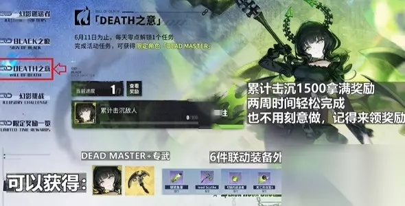 2、DEATH之意 版块完成奖励:角色DM+专武+6件联动装备外观 累计击沉1500拿满奖励 两周时间轻松完成,也不用刻意做,记得领奖励
