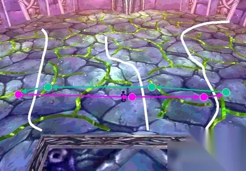 3、boss在进入战斗后90秒,进入第二阶段。此时boss不能攻击玩家,但是可以被攻击,同时会会施放一个疾病之云的技能,而后每90秒都会释放此技能,这时候boss周围大约10码的近战范围内所有玩家会受到一个疾病debuff,每5秒掉4000hp。 对策:第二阶段的时候,所有人包括MT在内必须躲避这个技能。 4、boss每隔一段时间会传送3个玩家到boss身后的眼柄通道,这个通道内有两种怪,一种是眼柄,类似克苏恩的眼球触须,会精神鞭笞,每下750hp。眼柄HP很少,大约500血,杀死之后半分钟刷新。还有一种怪是蛆虫,攻击布衣1000上下,但是移动速度很慢,而且一旦玩家跑出一定距离他就不会继续追下去。另外,当boss每隔90秒施放疾病之云的时候,这个通道会有每3秒4000左右自然伤害的毒云出现,所以在boss施放疾病之云之前,一定要跑出这个通道。 对策:注意3个人之间的协作,及时杀死小怪,而后跑出通道。从眼柄通道返回时,不要急着回到平台上,注意看清楚回平台的门口位置是否要喷射,而后再跑上平台。 5、boss房间有很多裂缝,每10秒钟,这些裂缝会喷发一次,造成4000左右的自然伤害,只会被完全抵抗,或者完全伤害。如果你在裂缝上没移动的话,伤害会累加,也就是说会受到两次4000的伤害,那基本就是死了。熔岩只会从亮绿色的缝隙中喷出来。白线分隔开的4个区域就是每次喷射的安全区(从右往左为1234)。图中的点表示你可以跑到的最接近下一个安全区,但是又不会被喷到的位置,这对于下一次及时跑位比较有利。注意从区域3到区域4和从区域2到区域1时都只需要跑很少一点距离,然后转身就可以了。