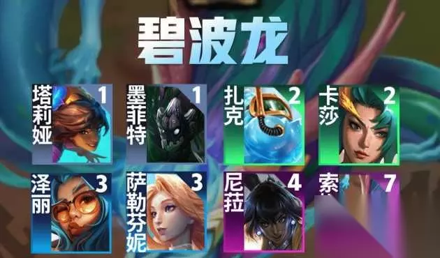 一、阵容组成:索姆、塞拉斯、尼菈、萨勒芬妮、墨菲特、泽丽、塔莉垭 二、羁绊效果:9碧波龙2格斗家3法师1龙神 三、运营技巧:在七级之前最好是不要搜牌,前期可以适当卖血抢装备(最好是第一波选秀可以拿到铲子合出碧波龙转职)。选秀过后要注意上一些高强度弈子,保住血量,不然后期很吃亏。四阶段上7搜出2星的塞拉斯和其他弈子1星即可,最好是可以再搜出一个索姆,然后就可以上8级成型。 四、强度解析:想玩这套阵容最好是有碧波龙转职,因为只有这样才能凑出9碧波龙,不然强度会很低。主C索姆必备蓝buff、秘典、珠光护手。主坦塞拉斯必备板甲,有条件上个狂徒提升坦度,后期有9碧波的话强度还是很高的,成型基本上可以进前二。 以上就是小编整合的云顶之弈碧波龙阵容最强,希望对大家有所帮助。后续还会推出更多云顶之弈游戏中的其他强势阵容介绍,以及详细的玩法运营技巧分享给大家,有感兴趣的小伙伴们可以多多关注。