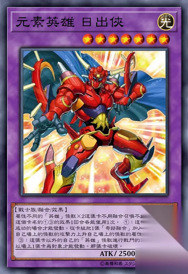 本期就让我们来看看元素英雄系列最近出的一张光属性·战士族的融合怪兽,唤醒你沉睡的元素英雄!(听这名字就挺燃的)只有融合召唤才能特殊召唤的召唤限制;和融合素材数量成比例的自我强化和攻击次数增加到融合素材中的融合怪兽数量的永续效果;和自身进行战斗的对手怪兽伤害计算后破坏并给予伤害的诱发效果;自身被破坏时从手卡·卡组特殊召唤战士族怪兽的诱发效果。