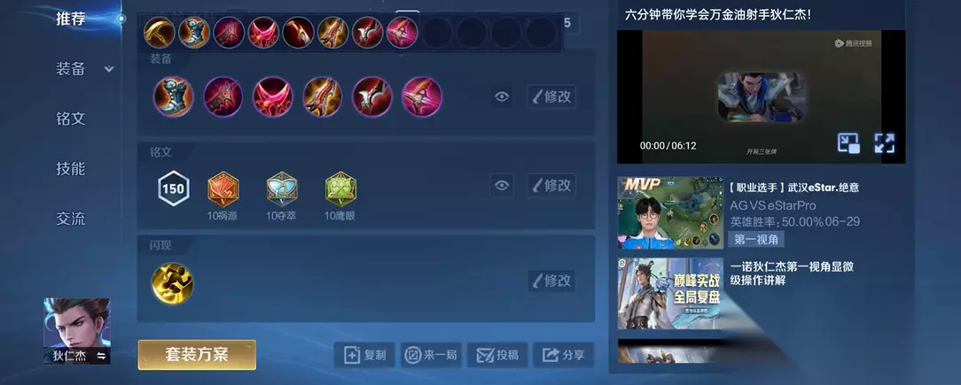 推荐10宿命、10鹰眼和8夺萃2兽痕。宿命提供攻速和生命值,鹰眼增加穿透,夺萃增强续航,兽痕补充暴击率。操作技巧上,二技能的解控时机是关键。优先解除反甲主动、白起嘲讽等致命控制。团战时站位靠后,利用普攻和一技能消耗,大招留给敌方关键英雄。如果对面有真伤英雄,比如吕布或貂蝉,可以提前做魔女斗篷或不祥征兆减速拉扯。布甲鞋可以换成复活甲或名刀,冰矛可以换破茧之衣针对法刺。 【小编推荐】专区入口 || 视频站入口 || 体验服申请入口 || 全民竞猜赢好礼 【新英雄爆料】| 司马懿 || 瑶 || 孙策 || 新英雄:囚徒/书圣/瞬 | 【新皮肤爆料】| 李白团战皮肤:敏锐之力new || 诸葛亮团战皮肤:掌控 || 典韦穷奇皮肤 Hot!! | 王者荣耀最新攻略 赛季段位继承表 每日一题 边境突围玩法攻略 体验服爆料