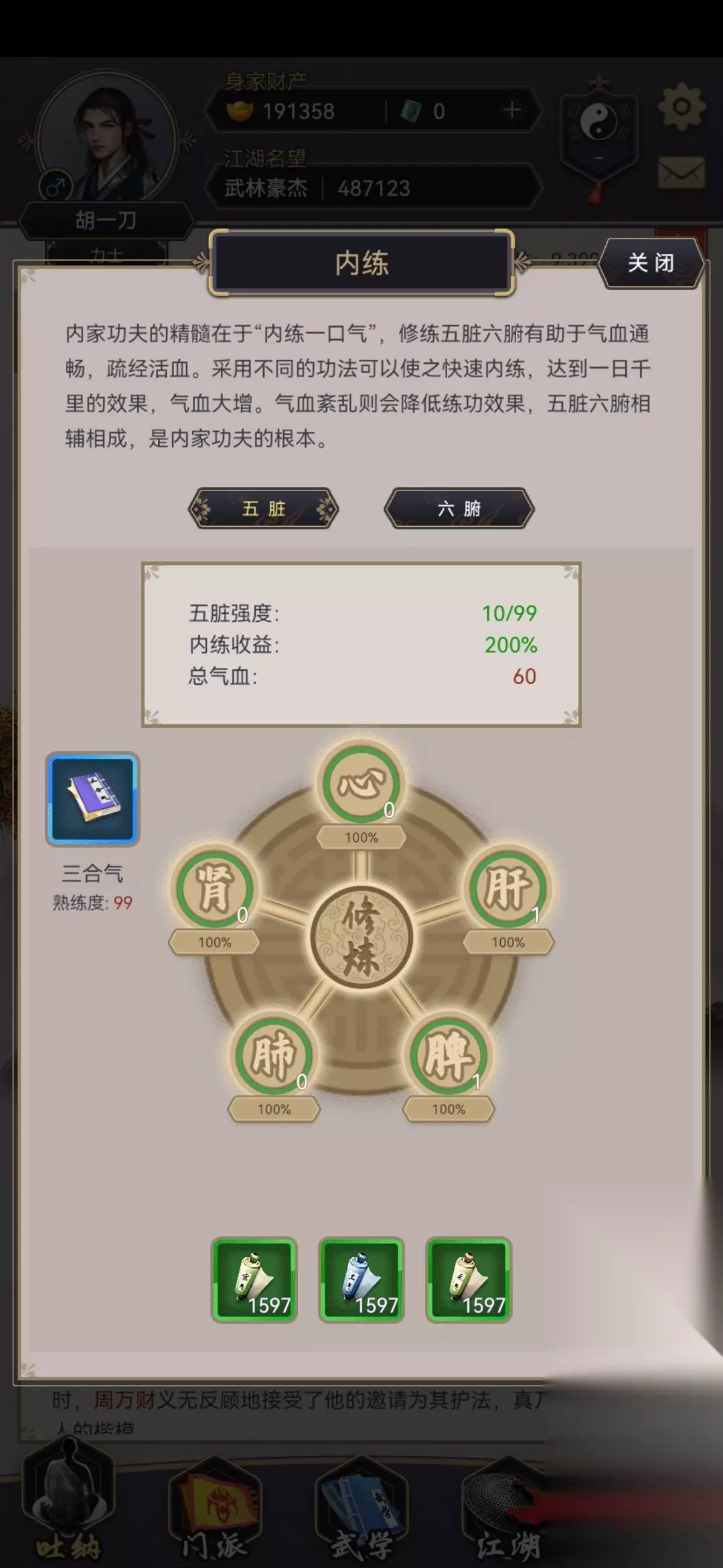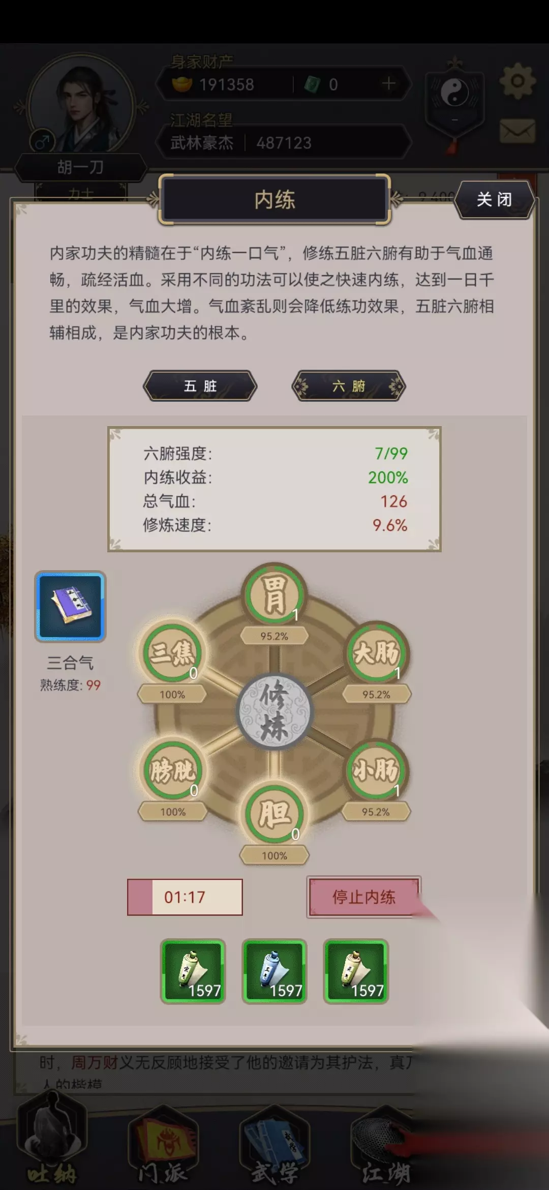作者:晴天 开内练后,我们需要两种材料,一种去祁连山兑换,这种材料不缺,另一种(气灵草和雪参果)去内家祖师兑换或者集市购买,一般这种材料是缺的! 大部分人用内功三河气,后期想升级到五禽戏或者七星诀,大家可以将三河气熟练度达到99后花一个玉壁升级,要是没有玉壁就用三河气,因为二者除了修炼点数和速度以外,其他没有区别! 刚开始内练时,大家手里如果有练气丹,凝气丹,聚气丹这些丹药,可以先用丹药增加经验,直接将五脏到五层可以开六腑!丹药要先用增加经验少的聚气丹,我就用错了,上来就用练气丹,浪费了很多经验! 提高三河气的熟练度可以增加修炼点数!其他功夫一样! 内练刚开始加的血不多,但是据说后来能加到1万+! 自己的经验,大家努力吧!
